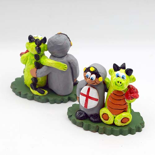 Red clay ceramic figure of Saint George and the dragon embracing on a ceramic pedestal